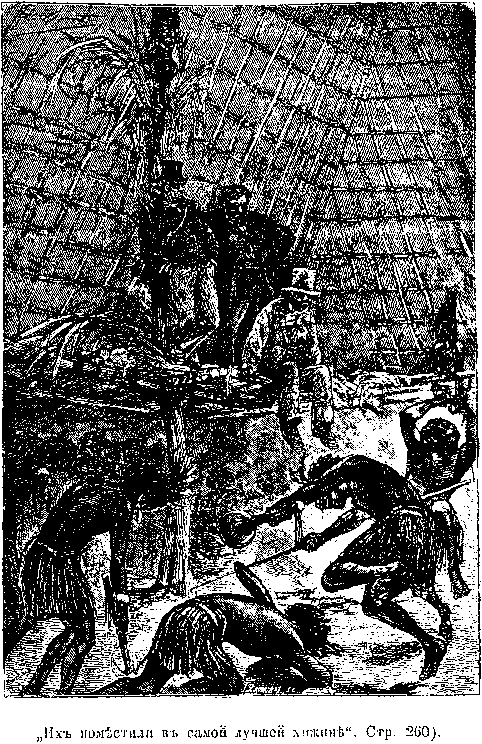 Филь Эвансъ былъ слегка раненъ пулею съ Альбатроса. Рана была незначительная, пустая царапина. Поэтому всѣ эти три бѣглеца сейчасъ же отправились вглубь острова, надѣясь встрѣтить туземцевъ.
