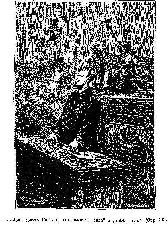 Робюръ даже бровью не повелъ. Скрестивъ на груди руки, онъ храбро ждалъ, когда снова водворится тишина.