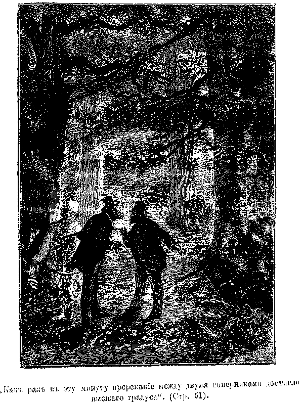 Слово за слово, послѣдовалъ обмѣнъ колкостей, и соперники, увлекшись незамѣтно для самихъ себя, пошли совсѣмъ не по тѣмъ улицамъ, по которымъ имъ слѣдовало идти. Такимъ образомъ, имъ предстоялъ огромный крюкъ.