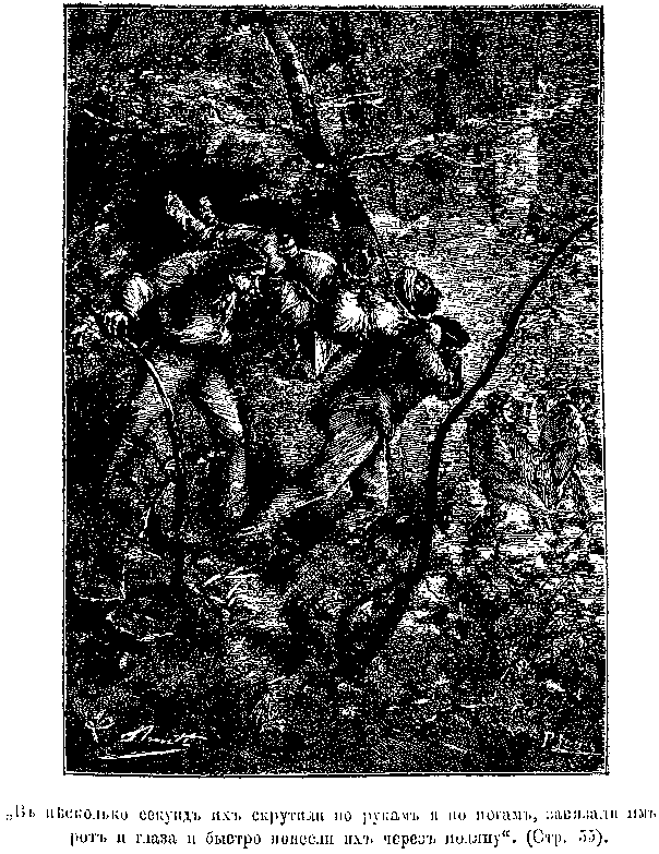 Быстрѣе, чѣмъ можно сказать словами, изъ-за деревьевъ выбѣжали шесть человѣкъ и кинулись двое на дядю Прюдана, двое на Филя Эванса и двое на Фриколена. Въ послѣднемъ случаѣ двухъ было слишкомъ много, потому что негръ не въ силахъ былъ защищаться: страхъ заковалъ его въ цѣпи.