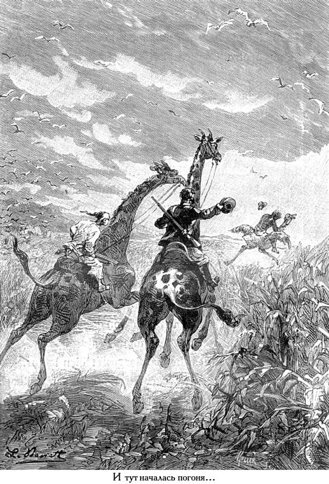 При падении бедный кафр получил тяжкие повреждения. Однако владевший им страх даже после такого удара не оставил его, а скорее удвоился. Убежденный, что он пропал, если подпустит к себе жестокого неаполитанца, Матакит быстро вскочил на ноги, ловким приемом отпряг страуса и, вскочив верхом, пустил его галопом. Вот тут-то и началась головокружительная гонка с препятствиями, какой мир не видел со времен римского цирка, где гонки на страусах и жирафах часто включались в программу состязаний.