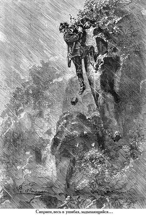 Проснувшись на заре, он почувствовал, что весь пылает в приступе горячки. Понимая, что погиб, если будет и дальше принимать холодный душ, ибо дождь уже лил как из ведра, Сиприен сделал усилие, поднялся на ноги и, опираясь на ружье, как на трость, стал спускаться вниз.
