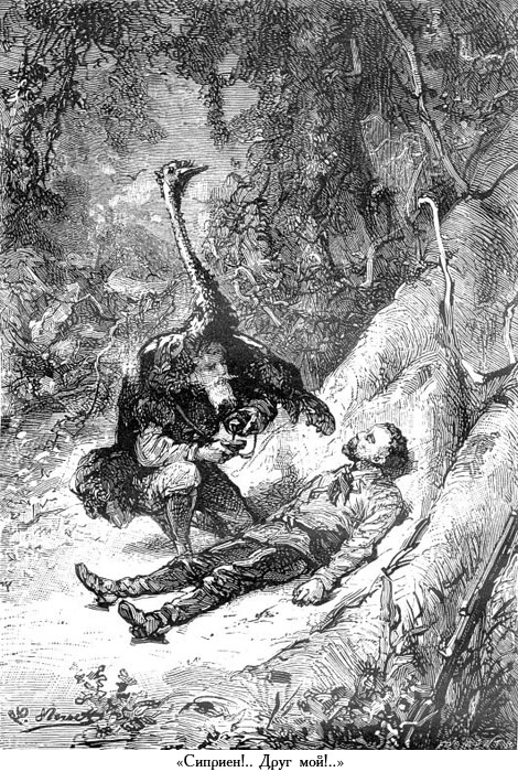 С наступлением утра дождь прекратился, уже довольно высоко поднялось над горизонтом солнце. Сиприен как раз открыл глаза. И безо всякого любопытства смотрел на рослого страуса, который, приблизившись, остановился в трех или четырех шагах от него.