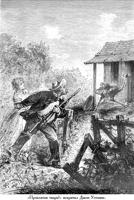 Джон Уоткинс не желал ничего слушать и выскочил на крыльцо, отыскивая глазами свою жертву. Наконец он заметил, что птица ищет убежища возле хижины Сиприена Мэрэ. Мгновенно вскинув ружье к плечу, мистер Уоткинс прицелился. Но в это время Дада, словно догадавшись о черных замыслах фермера, юркнула за хижину.