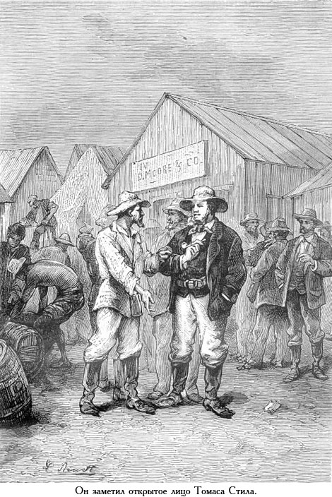 В тот момент рудокопы толпой возвращались в лагерь на второй завтрак. Разглядывая их загорелые лица, Сиприен спрашивал себя, к кому лучше обратиться за сведениями, которые были ему необходимы, как вдруг в одной из групп заметил открытое лицо Томаса Стила, бывшего старателя из Ланкашира. Со времени их приезда в Грикваленд ему уже случалось видеться с ним, и всякий раз он отмечал, что славный парень явно преуспевает, о чем свидетельствовала его румяная физиономия, новая, с иголочки одежда, а главное – широченный кожаный ремень, красовавшийся на его бедрах.