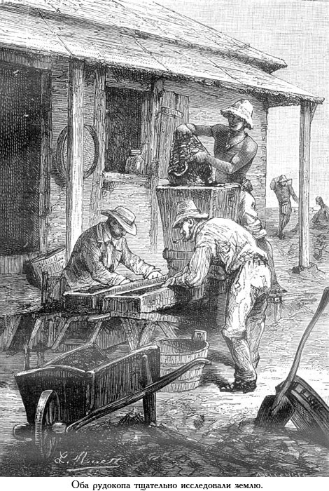 Процесс добычи был очень простым. Сначала оба компаньона размеренно, киркой и заступом накапывали некоторое количество грунта. Потом один из них взбирался на край рудника и развешивал вдоль железного троса полные ведра, поднятые снизу. Затем их перетаскивали в тележке к хижине Томаса Стила. Там, раскрошив с помощью увесистых чурбаков и очистив от камней, грунт пропускали через решето с ячейками по пятнадцать миллиметров шириной, чтоб отделить камешки помельче; их очень внимательно рассматривали, прежде чем выкинуть в отбросы. Наконец землю просеивали через очень частое сито, после чего она считалась годной для сортировки.