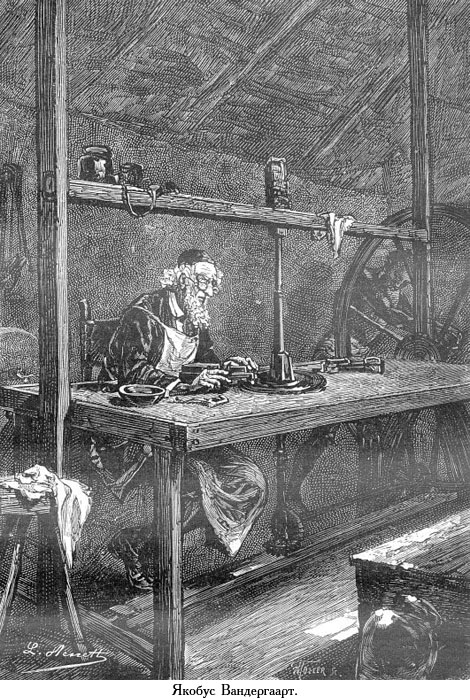 Сиприен, заказавший мастеру вделать в кольцо свой первый алмаз, очень скоро проникся к старику добрыми чувствами. Он охотно заходил в скромную мастерскую поболтать или просто составить хозяину компанию, когда тот работал за шлифовальным станком. Своей белой бородой, глубокими залысинами надо лбом, прикрытым ермолкой из черного бархата, длинным носом с насаженной на него парой круглых очков, Якобус Вандергаарт напоминал старого алхимика [39] [39]Алхимия – донаучное направление в химии, которое возникло в Египте (III-IV вв. н. э.) и получило особенное распространение в Западной Европе (XIII-XIV вв.). Алхимики искали «философский камень» для превращения неблагородных металлов в золото.
