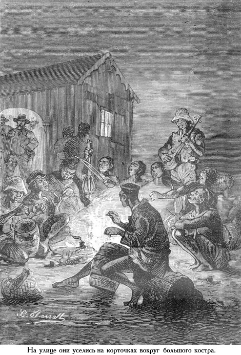 Но бедные негры вышли из дома еще до тоста, поднятого Джоном Уоткинсом, сразу же, как только отпала нужда в их службе. На улице они уселись на корточках вокруг большого костра на свежем воздухе и, оказав честь остаткам пиршественных мясных блюд, готовились к музицированию в той особой манере, которая принята в стране кафров. Гитары, сделанные из тыквы, флейты, в которые дуют через нос, всевозможные гремучие тамтамы [80] [80]Тамтам ( фр.tam-tam, заимствованное из хинди) – ударный музыкальный инструмент.