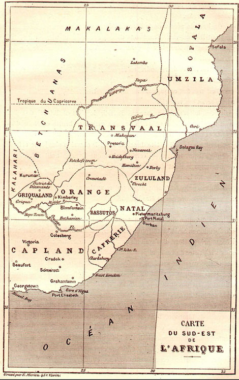 Трансвааль, который они собирались пересечь с юга на север,– обширная область Южной Африки, площадью самое малое в тридцать тысяч гектаров. Она простирается между Ваалем и Лимпопо к западу от Драконовых гор. Полностью колонизованный бурами, бывшими голландскими гражданами Капской области, число которых за пятнадцать – двадцать лет проживания там увеличилось более чем до ста тысяч, Трансвааль, естественно, оказался предметом вожделений Великобритании. И она в 1877 году присоединила его к своим капским владениям. Однако непрекращающиеся выступления буров, упорно стремящихся остаться независимыми, не дают пока оснований считать что судьба страны уже решена [82] [82]Через 20 лет после описываемых событий началась англо-бурская война 1899-1902 годов, которая закончилась поражением буров. В 1910 году, когда бывшие бурские республики были объединены в доминион Великобритании Южно-Африканский Союз, Трансвааль стал его провинцией. С 1967 года Южно-Африканский Союз переименован в Южно-Африканскую Республику. Доминион – государство в составе Британской империи, признававшее главой английского короля (королеву).