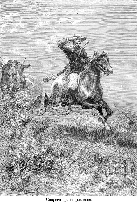 Сиприен, держа руку на карабине, две или три минуты ждал волеизъявлений его высочества льва. Но, видя, что высочество не настроено предпринимать враждебные действия, он не захотел нарушать счастливый покой почтенного семейства и, повернув коня, иноходью вернулся к своим спутникам. Вынужденные признать его хладнокровие и отвагу, те встретили его аплодисментами.