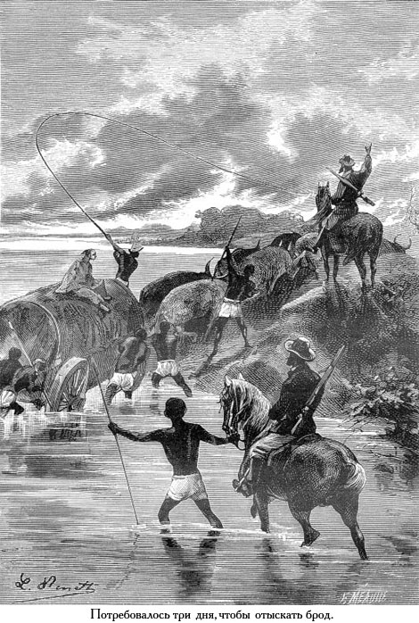 Потребовалось три дня поисков и зондирования, чтобы отыскать брод через русло Лимпопо. Надежность брода оставалась бы все равно сомнительной, если бы не слонявшиеся по берегу кафры племени макалакка, которые взялись провести экспедицию.