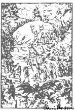 В глубине ведьма воздвигает своего Сатану, большого Сатану из дерева, черного и косматого. Рога на голове и стоящий около него козел напоминают Вакха. Мужские атрибуты указывают на Пана или Приапа. Мрачная фигура, которую каждый видел по-своему. Одни находили в нем только ужас, других поражала печальная гордость, в которую, казалось, был погружен вечный изгнанник...