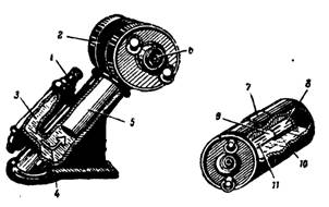 1-Взрыватель 2 – Держатель бомбы. 3 – Взрывная камера. 4 – Метательная сила, возникающая от взрыва. 5 – Стержень деря^теля бомбы. 6 – Винт, устанавливающий глубину взрыва бомбы. 7-Стальная оболочка бомбы. 8 – Взрыватель и механизм установки глубины. 9-Детонатор. 10– Заряд взрывчатого вещества» 11-Запальный стакан.