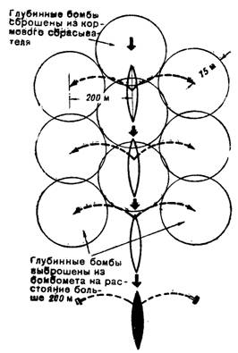 Теперь представим себе, что надводный корабль, вооруженный и кормовым сбрасывателем и бортовыми бомбометами, заметил погружающуюся подводную лодку. Он мчится к месту погружения, вот он Достиг его; тогда начинается сбрасывание бомб по ходу корабля и с обоях бортов. Корабле проносится, оставляя за собой большую площадь, усеянную бомбами. Взрывные волны распространяются по всей толще воды и образуют смертельно опасную вону, из которой подводной лодке очень трудно выбраться невредимой.