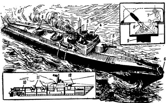 Один из проектов новейшего охотника за подводными лодками, вооруженного прицельными дальнобойными бомбометами в башенных установках: 1 – Кормовой бомбосбрасыватель. 2 – Прицельные дальнобойные бомбометы в башнях 3 – Управление огнем. 4 – Мощные прожекторы. 5– Орудия калибра 76 миллиметров 6-Якорь. 7 -Дальномер в башне. 8-бомбомет. 9 – Механизмы вращения и обслуживания башни. 10 – Механизмы кормового бомбосбрасывателя. 11 – Башни бомбометов, 12 – Орудия корабля.