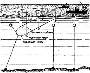 Лебедка-вьюшка о тралом находится на одном из тральщиков. Корабли сближаются, и тогда с тральщика, где находится трал, на второй корабль передают один бросательный конец» – пеньковый трос– «рукоятку», который привязан к концу тралящей части. После этого корабли расходятся на всю длину тралящей части. Пока это длится, трал медленно разматывается, а моряки с первого тральщика надевают на «лезвие» кошки, а на оттяжки глубины– буйки и грузы. Трал погружается в воду уже снаряженным для подкашивания мин. Когда вся тралящая часть опущена, «вытравлена» в воду, тральщики одновременно идут вперед параллельным курсом, увлекая за собой уже готовое ii действию «лезвие» подводной «жатки».