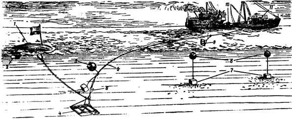 1 – Поплавок удерживает конец трала далеко в стороне от курса корабля-тральщика. 2 – Руль, обеспечивающий постоянное положение поплавка. 3– Затраленная мина. 4– Углубляющее устройство, которое удерживает подсекающий конец трала на заданной глубине. 5 – Тралящая часть, в – Минреп затраленной мины соскальзывает на резак, перебивается, и мина всплывает на поверхность. 7 – Якоря мин. 8 – Мины в заграждении. 9 – Устройство, которое углубляет тралящую часть и отводит ее я сторону от тральщика. 10 – Тральная лебедка. 11 – Блок.