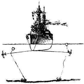 Параван – это защита против якорных мин. Тралящая часть паравана-его «усы» – захватывает трос-минреп мины. Затем минреп скользит по тралящей части, точно по наклону, и приближается к резаку, который пересекает, рубит его. Трос падает на дно, а подкошенная мина всплывает на поверхность довольно далеко – в 15– 25 метрах от корпуса корабля. Чтобы обезвредить всплывшие мины, их тут же расстреливают из легких орудий.