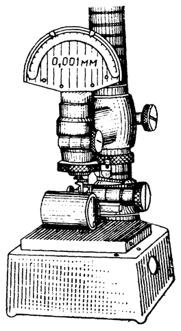 При контроле однородных по типу и размерам деталей даже малоквалифицированный рабочий в состоянии вести проверку со значительной быстротой. Система рычагов и оптических приспособлений обеспечивает тысячекратное увеличение показаний мерительного стерженька. Это значит, что движение стерженька вверх на 0,001 миллиметра отражается передвижением черты «зайчика» на полный миллиметр по шкале. Так как по ней также можно отсчитывать части миллиметра, то и на этом приборе доступно достижение точности, выражаемой десятитысячными долями миллиметра.