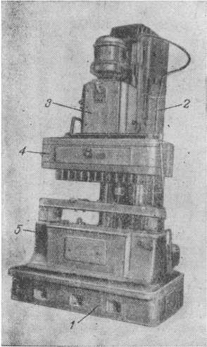 Вертикальный 54-шпиндельный сверлильный агрегатный станок: 1 – основание; 2 – колонна; 3 – силовая головка; 4 – шпиндельная коробка; 5 – приспособление