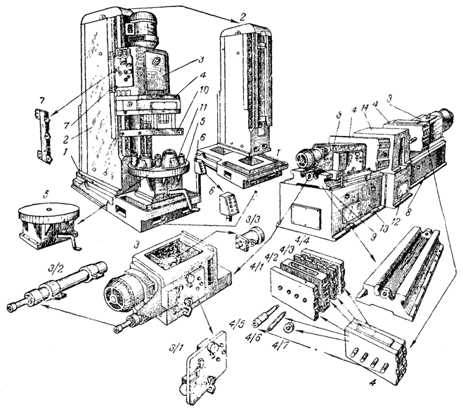 Цифрами 1—13 показаны основные узлы и детали станков, а дробными числами – отдельные части и детали главных узлов: силовой головки 3 (цифры знаменателя в дробях с числителем 3) и шпиндельной коробки 4 (цифры знаменателя в дробях с числителем 4)