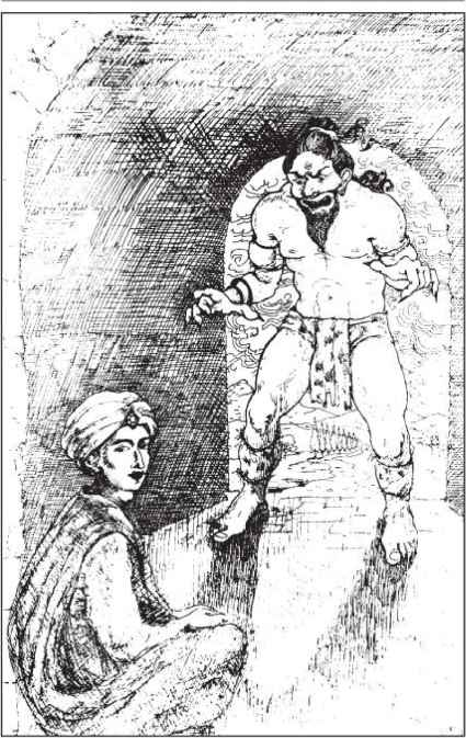 Но Сутасома не выказал ни малейшей тревоги. Он сказал: «Если Калмашапада пришел к нам в гости, нам следует почтить гостя». И он вышел навстречу пришельцу и увидел человека, подобного громадному зверю, который преследовал бежавшее войско. Грязные одежды людоеда развевались во все стороны, на голове была повязка из мочалы, глаза его вращались свирепо и яростно.