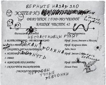 Агата слабо кивнула, прислонившись к одному из туалетных столиков в ванной башни Чести, инкрустированной сапфирами. Она никогда не думала, что будет так счастлива видеть этих двух ведьм. В отличие от остальных девочек, ни одна из них не изменилась. Красно-черные волосы Эстер были засалены как никогда, а татуировка – рогатый демон на её шее, цвет которого после неудачного заклинания потускнел в прошлом году, – вновь обрела насыщенно-красный цвет. Между тем Анадиль еще сильнее побледнела, если это было возможно для альбиноса с призрачно-белой кожей и волосами. Сидя на раковине рядом с Эстер, она болтала, словно маятником, живой ящерицей перед носами трех черных крыс, которые были точь-в-точь как те, что погибли в прошлом году в войне между Добром и Злом.