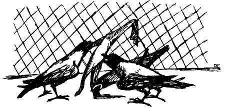 Они развязывали узлы на веревках, которыми мы крепили к стенкам жердочки для отдыха. А если снаружи оказывалась тряпка (или кусок полиэтилена), то все население вольеры трудилось до тех пор, пока не втаскивало ее через сетку внутрь. Однажды вечером, почти затемно, мы обнаружили, что в рубероиде, которым была покрыта вольера, проклевана небольшая дырка. Заниматься ремонтом было поздно, поэтому мы просто набросили на это место лабораторный халат из опасения, что рано утром птицы расширят дыру и улетят.