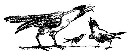 Иногда дело этим и оканчивается, но обычно это только начало вороньих игрищ! К первым двум птицам присоединяется третья, и в течение нескольких минут щепка (или другой небольшой предмет) переходит из клюва в клюв. Причем переходит без драк и угроз, а вполне добровольно, как будто бы птицы повинуются какому-то хорошо известному игровому правилу. Но проходит несколько минут, и щепка снова валяется на земле и, может быть, уже никто никогда не обратит на нее внимания.