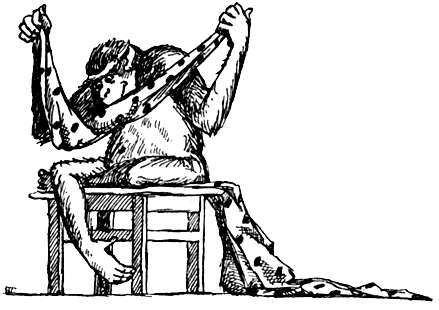Заманивая Иони в клетку, туда помещали какой-нибудь соблазнительный предмет. Чтобы достать предмет, он применял разнообразные уловки. Просунувшись в клетку наполовину через открытую дверцу, он пытался дотянуться до игрушки. Это ему не удавалось, потому что нужно было все время следить за тем, чтобы сидящая около двери в клетку воспитательница не захлопнула ее. Он цеплялся за край дверцы рукой, вставлял руку между дверью и косяком. Поскольку так у него тоже ничего не получилось, он прибегнул к новому маневру: уцепившись левой рукой за ремень, свисавший с потолка клетки, поставил ногу на порог клетки, препятствуя тем самым закрыванию двери, а правой рукой попробовал дотянуться до игрушки.
