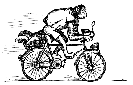 Где бы детеныш шимпанзе ни рос – в джунглях или в профессорской семье, – больше всего он любит побегать. При этом он предпочитает убегать, а не догонять, – совсем как большинство детей. И те и другие малыши очень любят на чем-нибудь ездить (на санках, на тележках и т. п.), и чем быстрее, тем лучше. Как и все дети, детеныши обезьян и в природе, и в неволе обожают передвигаться верхом на взрослых. Как и дети, некоторые шимпанзе могут научиться ездить на велосипеде, и очень любят это занятие.