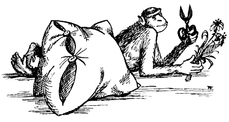 В своих играх, и в одиночных, и в групповых, детеныши обезьян зачастую прибегают к хитрости и обману. Они используют разные приемы и уловки, чтобы заставить партнеров сделать то, что им нужно, или, наоборот, чтобы отвлечь их от действия нежелательного. Например, одной из любимых шалостей Иони было пожевать что-нибудь неподходящее – кусок штукатурки, отколупнутой от стены, мелкие гвоздики, пуговицы и т. д. Когда Иони заставали за этим занятием, его уговаривали все выплюнуть, и он соглашался. Когда во рту ничего не оставалось, Иони пускал на подставленную руку слюну, и Надежда Николаевна поскорее руку отдергивала. Иони быстро сообразил, что это хороший способ отделаться от опеки, и стал пользоваться этим приемом для отвода глаз.