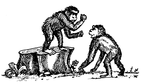 Так, например, Джейн Гудолл в трех различных случаях наблюдала, как вольные самцы – подростки шимпанзе устраивали устрашающие демонстрации в лесу, вдали от своих сородичей, где никто не мог их видеть. Похоже, что они просто «репетировали», «проигрывали» ситуации, в которых эти угрозы могут понадобиться. В одном из таких случаев молодой самец Фиган «играл в вожака». Настоящим вожаком в этой группе был Майк. Мы уже говорили про этого выдающегося самца, который добился своего высокого положения благодаря своей изобретательности.