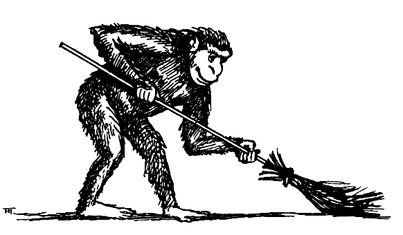 Часто обезьяны в зоопарке стараются копировать те манипуляции с предметами, которые, как они видят, проделывают люди. Одна человекообразная обезьяна, попав по недосмотру служителей в «предбанник» клетки (небольшое помещение, которое устраивают перед клетками с крупными животными в целях безопасности), схватила метлу и принялась старательно подметать пол, в точности копируя движения человека.