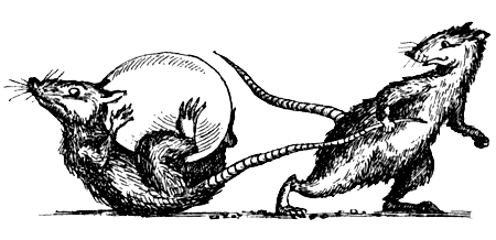Скорее всего, это была просто чья-то выдумка, принятая на веру. А может быть, описавший этот случай человек заблуждался вполне искренне. К такому предположению мы пришли, наблюдая за поведением крыс в вольере, куда им бросили сваренное вкрутую яйцо. Оказалось, что все животные (их было примерно 5–6) сильно возбудились. Они попеременно, отталкивая друг друга, набрасывались на новый предмет, пытались «обнять» его лапами, и часто падали на бок, захватив яйцо всеми четырьмя конечностями. В такой сутолоке, когда упавшую с яйцом в лапах крысу подталкивают остальные, вполне может возникнуть впечатление, что одна из них тащит другую.