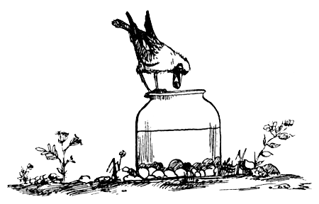 Совершенно такую же историю рассказал человек, который вырос в глухой деревне на Украине и ни Аристотеля, ни Бэкона не читал. Зато в детстве ему самому удалось наблюдать очень похожий факт. Он с удивлением обнаружил, как выращенный им ручной галчонок бросал камешки в банку, на дне которой находилось немного воды. Когда камни достаточно поднимали уровень воды, галчонок пил.