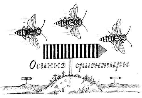 Затем оса взмыла в воздух, описала над этим местом несколько кругов, которые с каждым разом становились все шире, и улетела…». Добавим, что роющая оса, совершая круги над своей норкой, запоминает местность. В ориентации осы при возвращении в гнездо важную роль играет запоминание различных ориентиров.