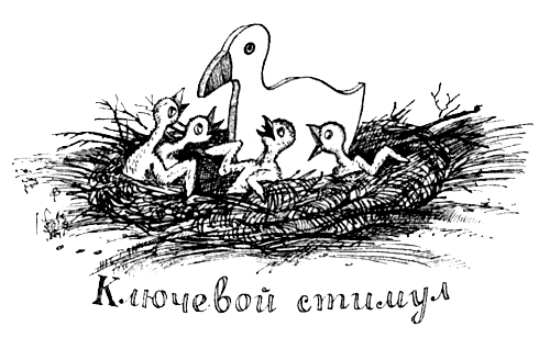 Тинберген обратил внимание на то, что птенец обыкновенной чайки, выпрашивая корм, ударяет клювиком по клюву взрослой чайки и никогда не просит еду у своих сверстников. Изготовив несколько моделей головы чайки, в разной степени похожих на настоящую, он обнаружил, что для птенца важно, чтобы на модели было красное пятно, в остальном же модель может быть откровенно грубой и примитивной. Более того, оказалось, что самыми популярными кандидатурами на роль родителя были вырезанные из картона силуэты, у которых весь клюв был красным. Они совсем не были похожи на настоящих чаек, но птенцов это не волновало: для них ключом служил красный цвет, столь контрастирующий с черно-бело-серебристым оперением чаек. Вот так и стали зоологи называть подобные стимулы ключевыми.