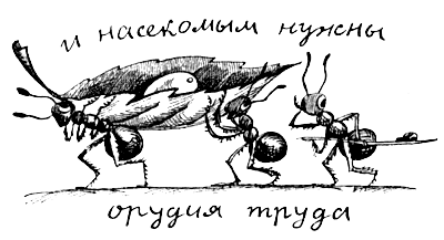 Другие насекомые пользуются орудиями в иных целях. Например, роющая оса, засыпав песком вход в свою норку, куда она только что отложила яйцо с запасом корма для будущей личинки, тщательно его утрамбовывает. Для этого она пользуется камешком, зажатым в челюстях.