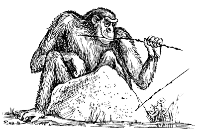 Другое дело – шимпанзе. Они ведут себя более рачительно и термитников не разрушают. Обезьяна подбирает тонкую палочку или отламывает прутик, обрывает с него листья и опускает в термитник через какое-нибудь отверстие. Потом она осторожно вытаскивает свое орудие и слизывает с него прицепившихся личинок.